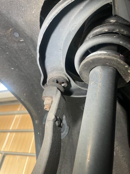 足回りを点検したところ、フロントサスペンションのアッパーアームについているボールジョイントのブーツが完全に破れておりました。
